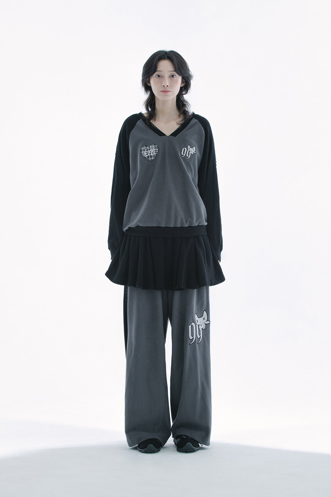 Patch skirt layered jogger pants (Charcoal)